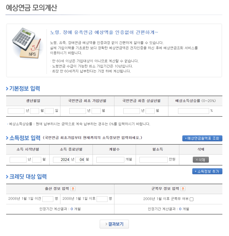 - 국민연금공단 홈페이지에서 '예상연금간단계산' 서비스를 이용할 수 있습니다.